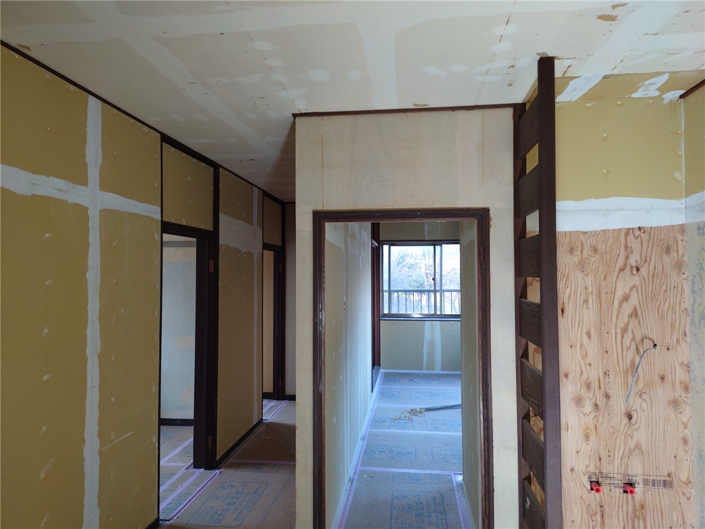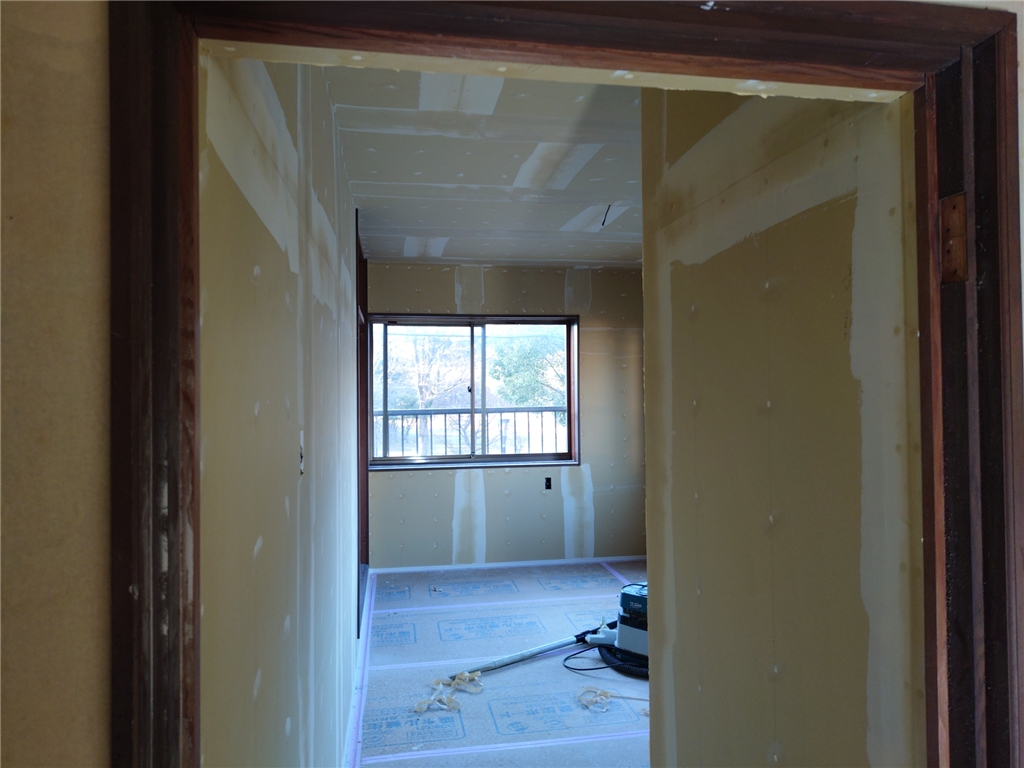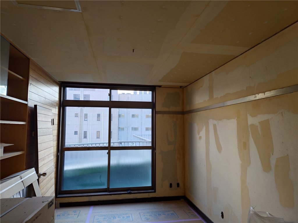 山口市 リノベーション工事 クロス下地のパテ処理を行っております。
