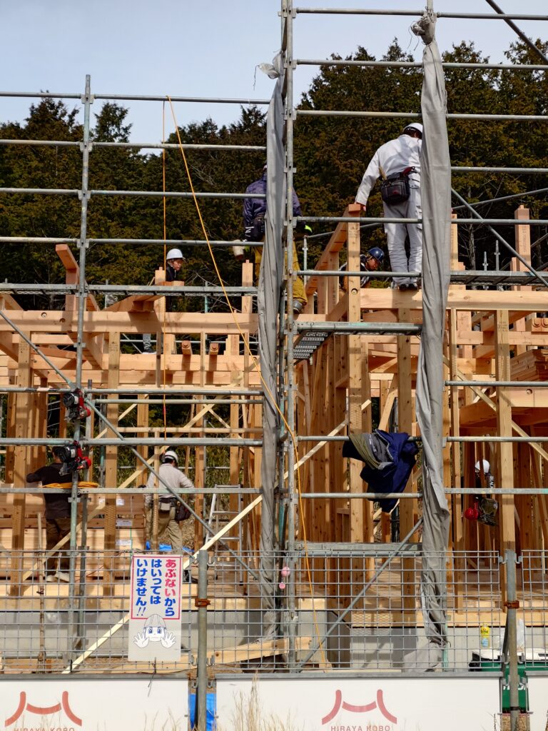 朝から大工さんたちが連携しながら作業を進め、柱・梁が次々と組みあがり、