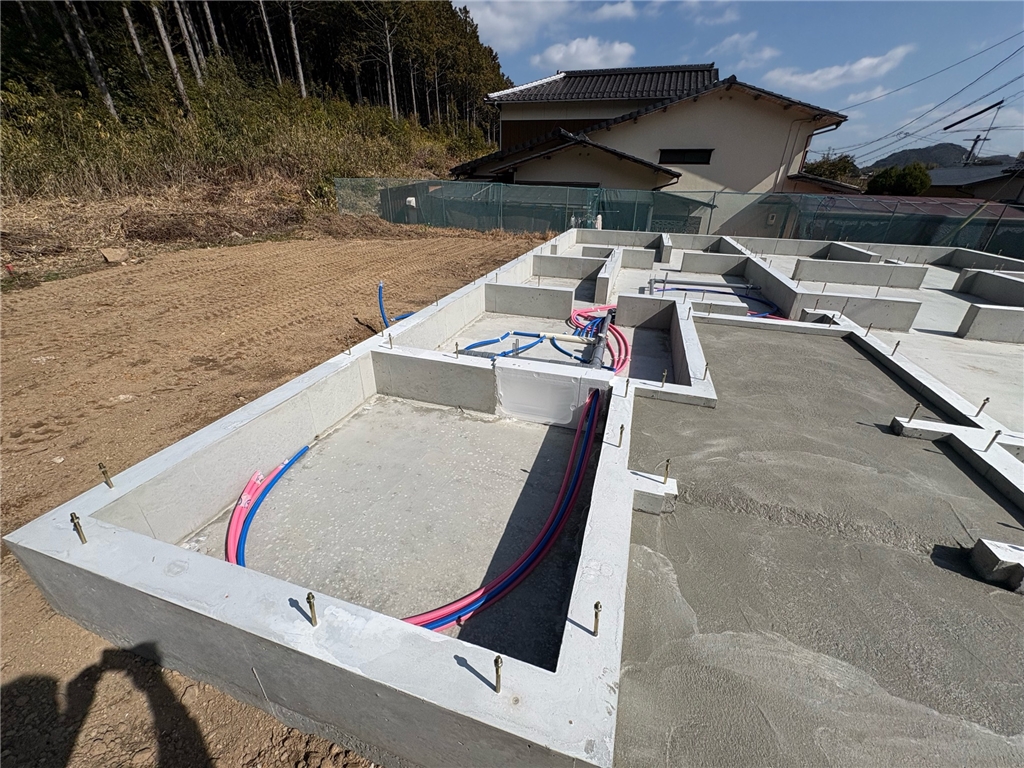 山口市I様邸の給排水工事、土台の墨出しが完了しました。