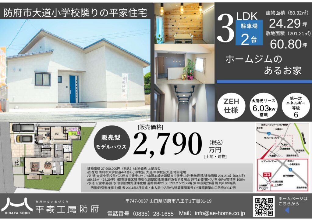 防府市 大道小学校隣り 3LDK 平屋モデルハウス内覧可能です。
