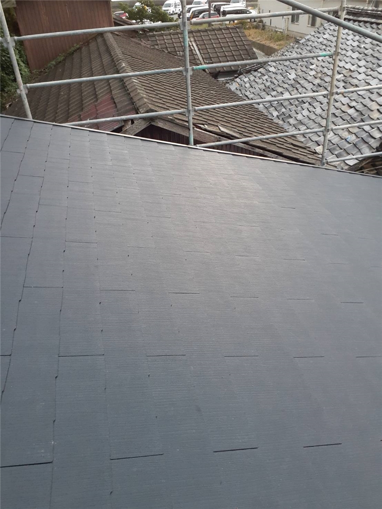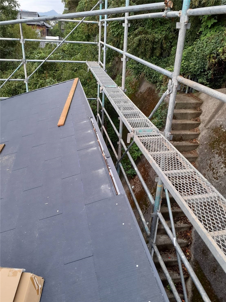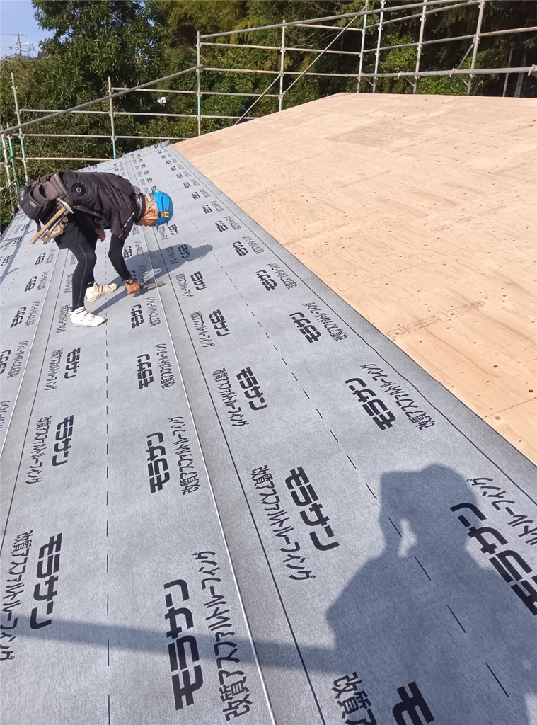 防府市 平屋・インナーガレージ住宅 屋根工事 2025.09.25 防府市 平屋・インナーガレージ住宅 棟上げを終え屋根工事を行っております。 ◇ルーフィング施工中◇ ◇棟換気施工◇ カラーベスト屋根工事が完了しました。 お知らせに戻る